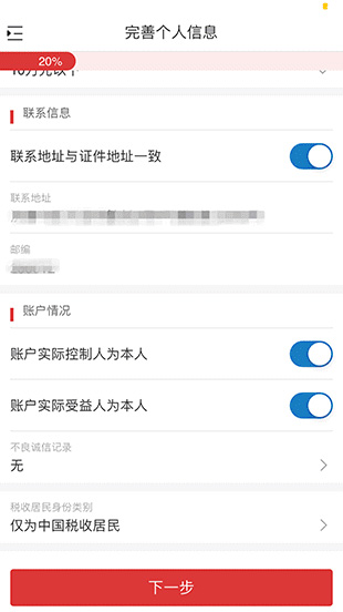 4、請認(rèn)真核對系統(tǒng)識別的信息是否正確,如有錯誤請手動進(jìn)行修改;在頁面下方選擇【行業(yè)】、【職業(yè)】、【學(xué)歷】等選項,然后點(diǎn)擊【下一步】。