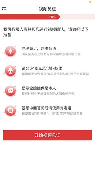 8、進(jìn)入視頻見證,確認(rèn)網(wǎng)絡(luò)通暢無誤后點(diǎn)擊【開始視頻見證】。視頻見證成功后,點(diǎn)擊【下一步】。
